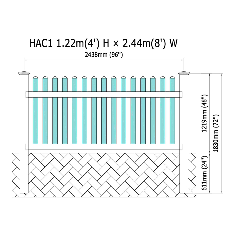 | Fál Stíl Barr | Fál picket pvc 4'hx8'w |