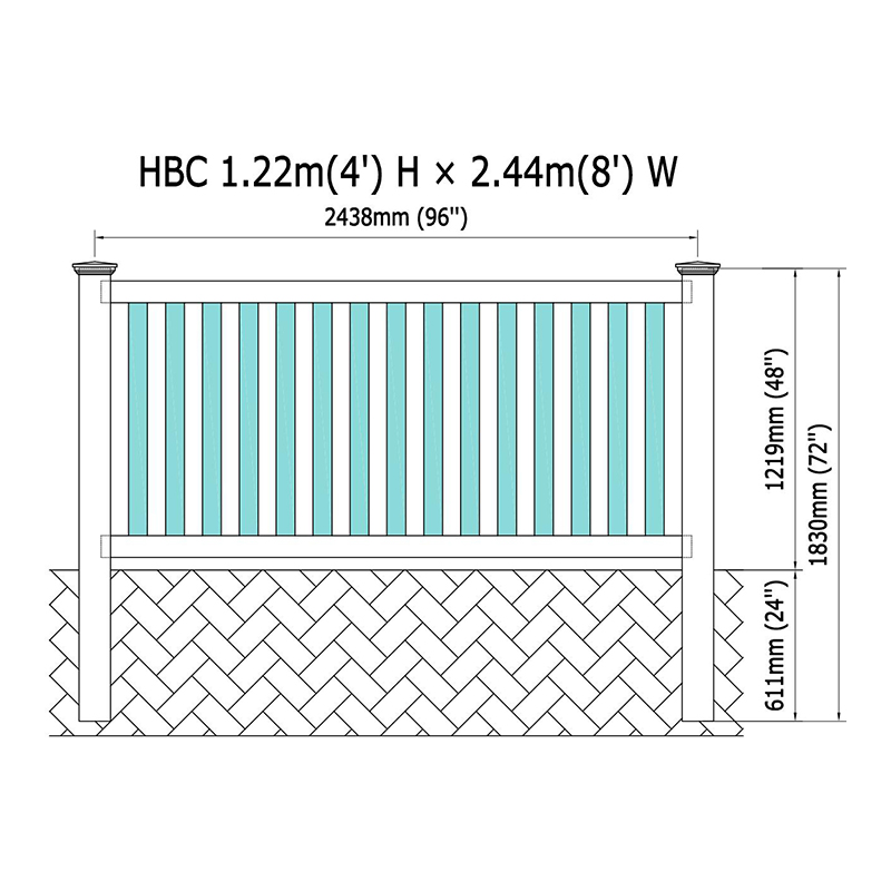 Le caipíní láidre Sasana Nua, cothrom nó Gotach, tá ráillí barr agus bun réamhtheachtaithe san áireamh freisin le haghaidh cóimeála gan uaim. Soláthraíonn cuir isteach alúmanaim sa iarnród íochtair neart grád tráchtála, ag cinntiú fad saoil agus cobhsaíocht. Tá na toisí caighdeánacha picéad de 7/8 "x 3" x 40 "deartha le haghaidh spásáil agus sláine struchtúrach is fearr, rud a fhágann gurb é an fál seo an rogha deiridh do aeistéitic agus feidhmiúlacht araon.